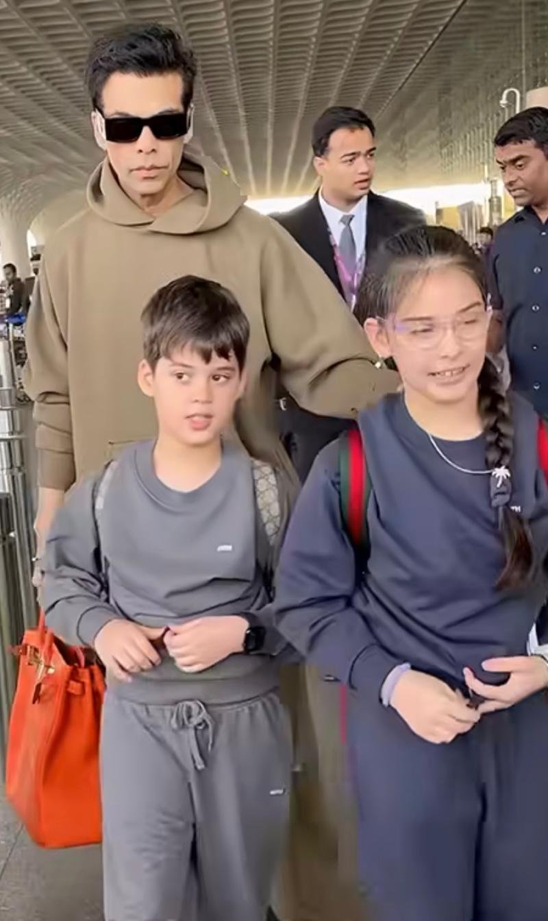 On Friday, KJo was spotted at the airport, looking effortlessly stylish in a co-ord set while also taking a moment to pose for the photographers. In a video that surfaced online, Karan was seen walking with his little munchkins. The family of three sported casual yet chic outfits. While the kids wore comfy tracksuits, Karan opted for a brown-coloured co-ord set for his airport look.